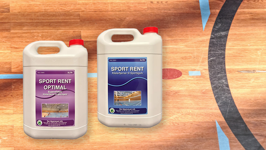 Maske forteller at produktene fjerner håndballklister, svarte gummimerker, fett og andre problemflekker på alle typer sportsgulv.